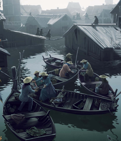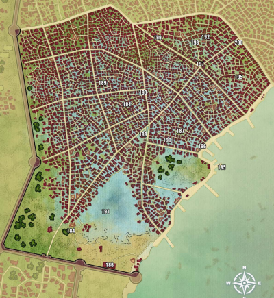 Mundane life endures in the Puddles, regardless of sewer water levels. Inns, restaurants, shops, and homes all have their first floors flooded daily with the tides—and not all residents have higher ground to escape to—yet shops open and patrons slog through the waters to go about their business. The desperate residents have begun manufacturing shoddy flood barriers around their properties or frantically shoveling the land into tiny islands for some respite from the rancid water. The local Skiffers’ Guild offers passage in agile skiffs that weave through flooded alleys. They’re limited on where they can deliver their passengers, however, depending on which local resident or faction has claimed the makeshift islands.